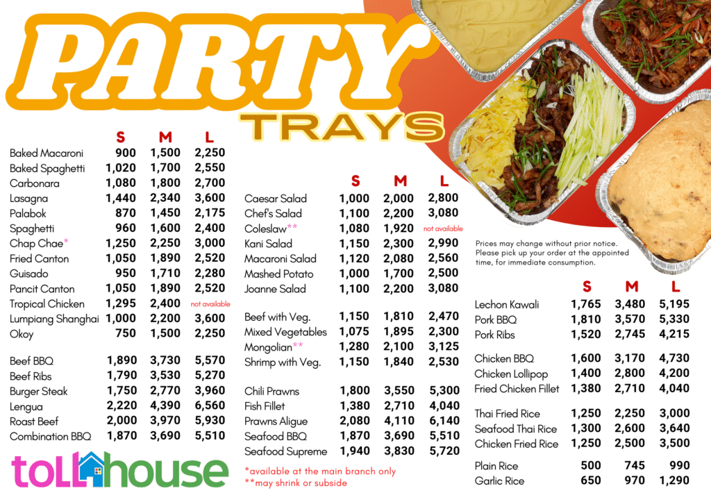 Here is our party tray menu for take out or delivery (thru any of our delivery partners).